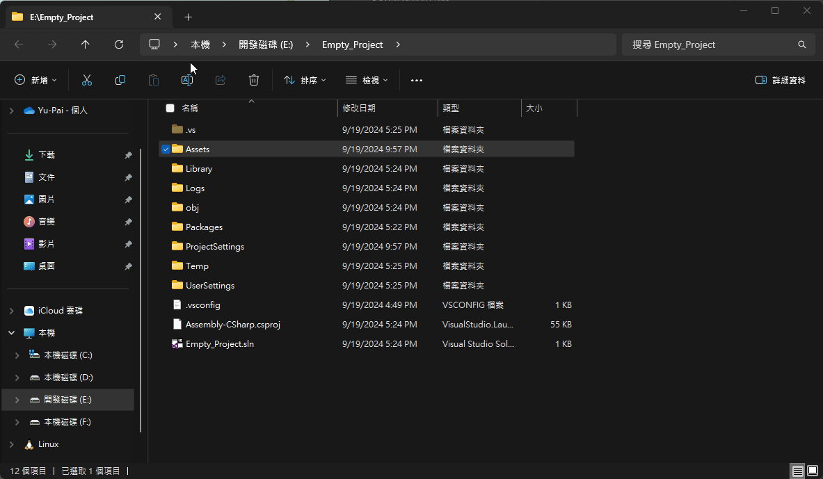 在 Unity 編輯器 中,點選上方選單的 Assets > Show In Explorer,這會快速開啟你的專案資料夾。