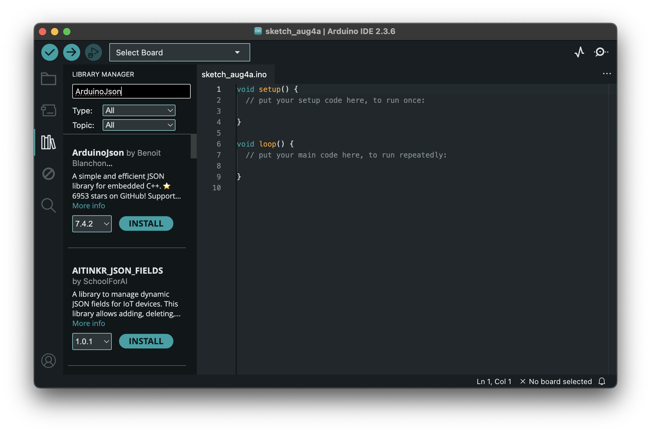 - 在 Library Manager 搜尋欄中輸入「ArduinoJson」。