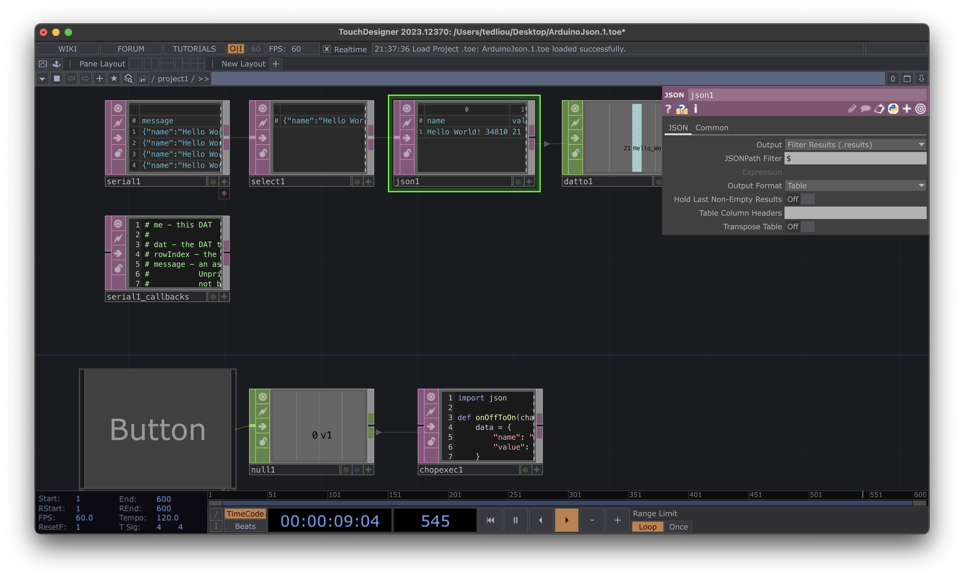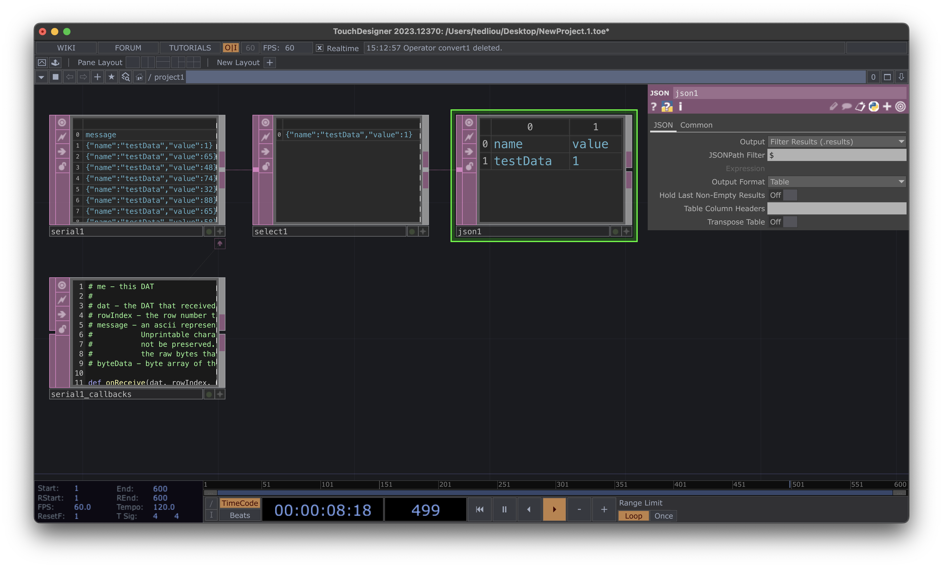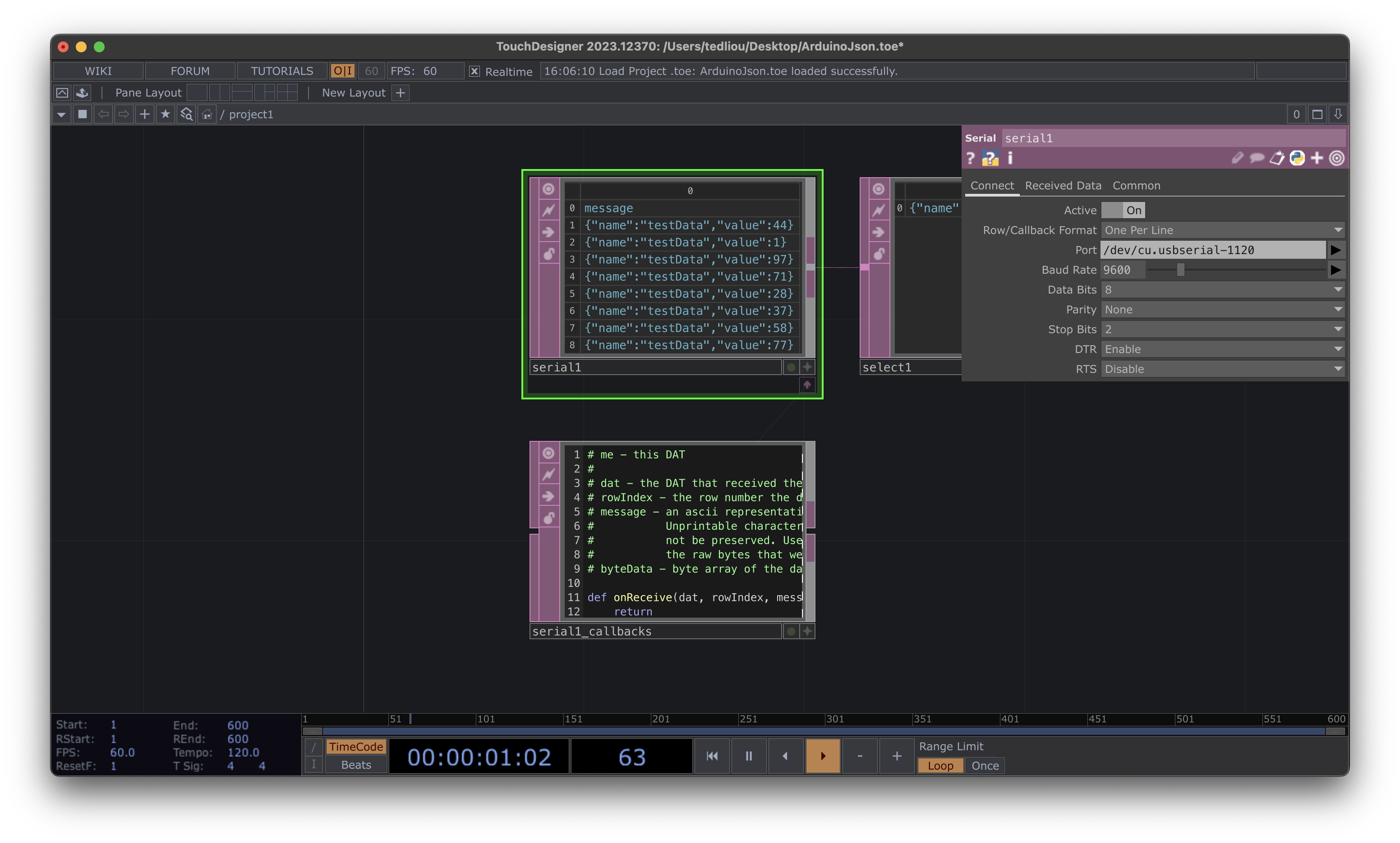 TouchDesigner 作為一款強大的即時互動媒體開發工具,也能夠非常方便地接收和解析來自 Arduino 的 JSON 資料。我們將使用 Serial (DAT)、Select (DAT) 和 JSON (DAT) 等節點來處理資料流。