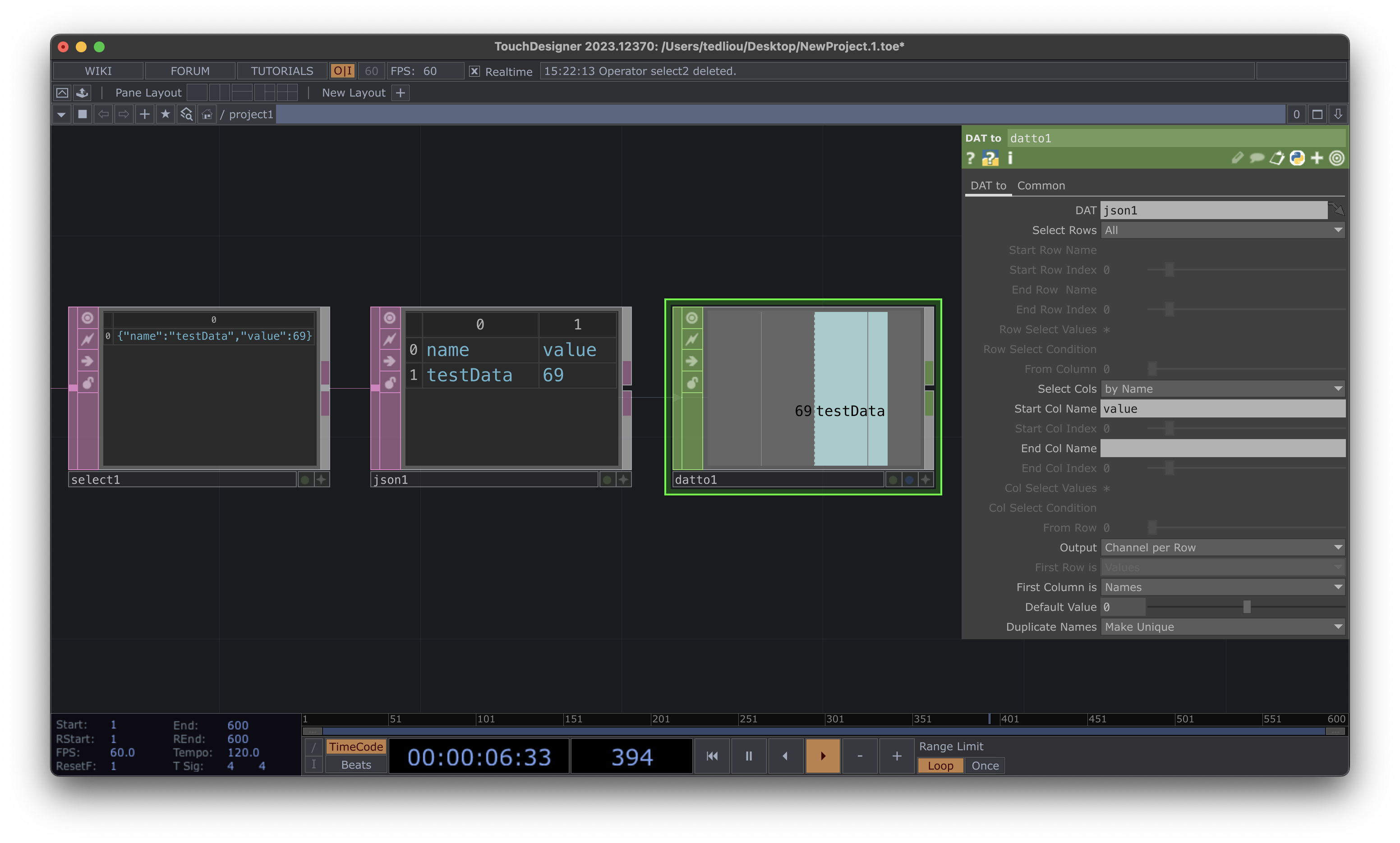 - 新增一個 JSON (DAT) 節點,並將其輸出連接到 Select (DAT) 的輸出端。這個節點負責將 JSON 字串反序列化。
