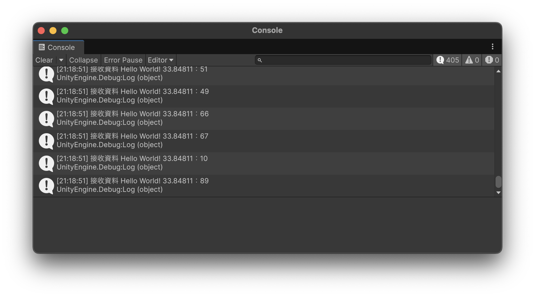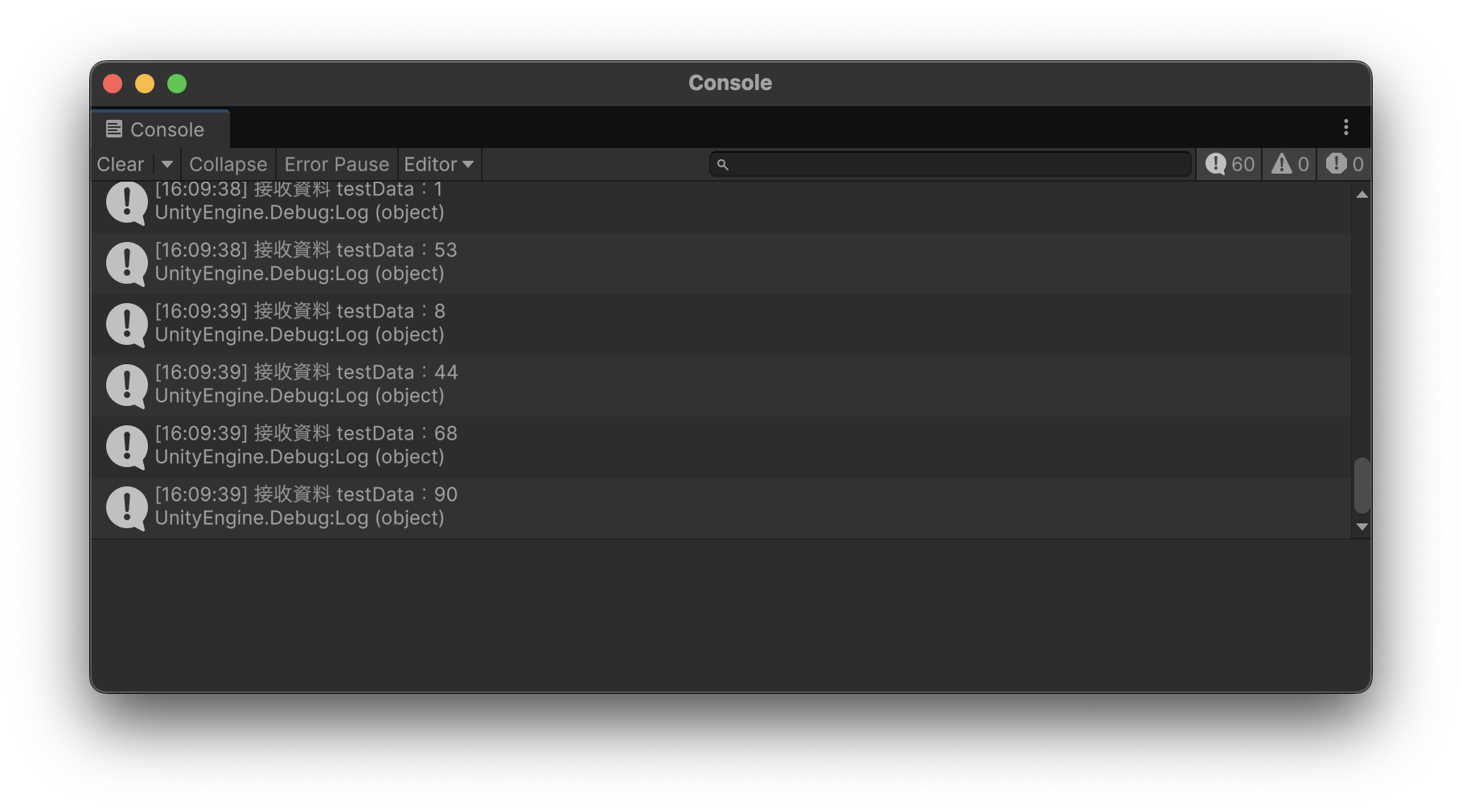 36 Debug.Log($"接收資料 {data.name}:{data.value}");