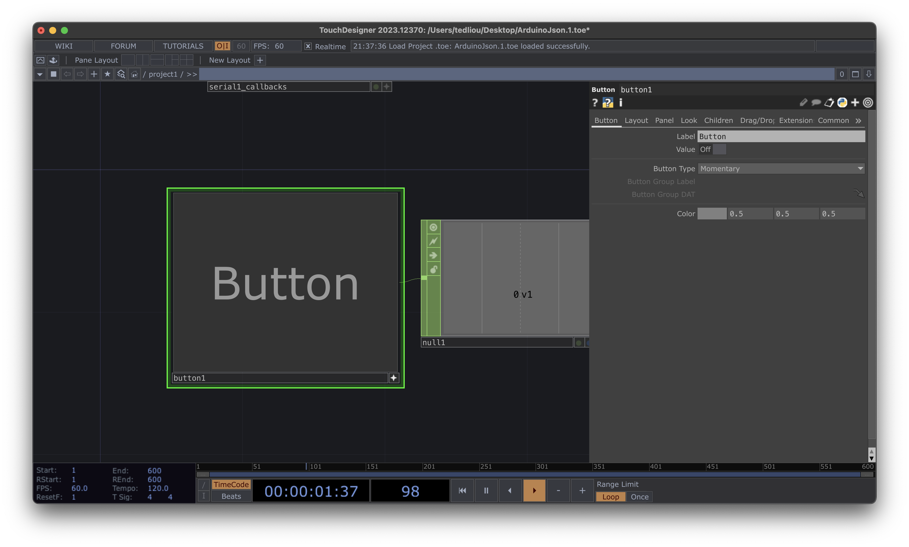 完成設定後,點擊 TouchDesigner 網路編輯區中的 Button (COMP)。你會發現,這時 Arduino 透過 Serial Monitor(或 Unity Console)發送的 name 內容就會改變,顯示為 "Hello World! [時間戳記]" 的格式。這實現了與 Unity 類似的控制效果,證明 TouchDesigner 也能成功向 Arduino 發送指令並改變其行為模式 (原始碼下載)。