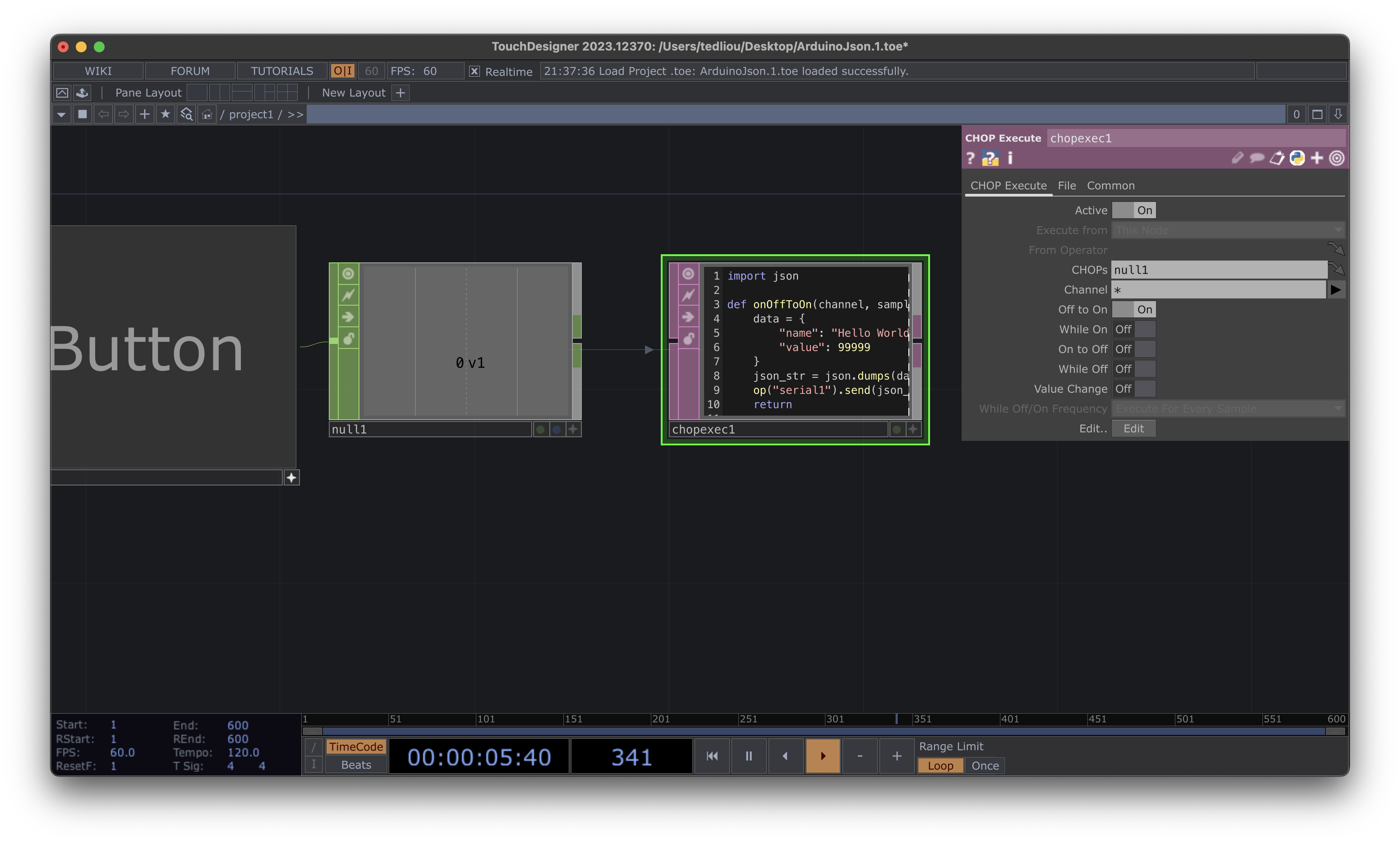 import json:引入 Python 內建的json模組,用於處理 JSON 資料的序列化與反序列化。onOffToOn(channel, sampleIndex, val, prev):這是CHOP Execute (DAT)在Off to On事件發生時會自動呼叫的函式。data = { ... }:建立一個 Python 字典,其鍵名name和value與 Arduino 端的 JSON 結構 (InputData類別) 保持一致。name欄位使用了 absTime.frame 來取得當前 TouchDesigner 的幀數,使其每次發送都帶有獨特的識別。json_str = json.dumps(data):將 Python 字典data轉換為 JSON 格式的字串。op("serial1").send(json_str, terminator="\n"):這行是關鍵!它透過名稱為"serial1"的 Serial (DAT) 節點(假設你先前的 Serial (DAT) 節點名稱為serial1)發送 JSON 字串。terminator="\n"參數確保在發送的字串末尾加上換行符,這樣 Arduino 才能正確識別一條完整的 JSON 訊息。