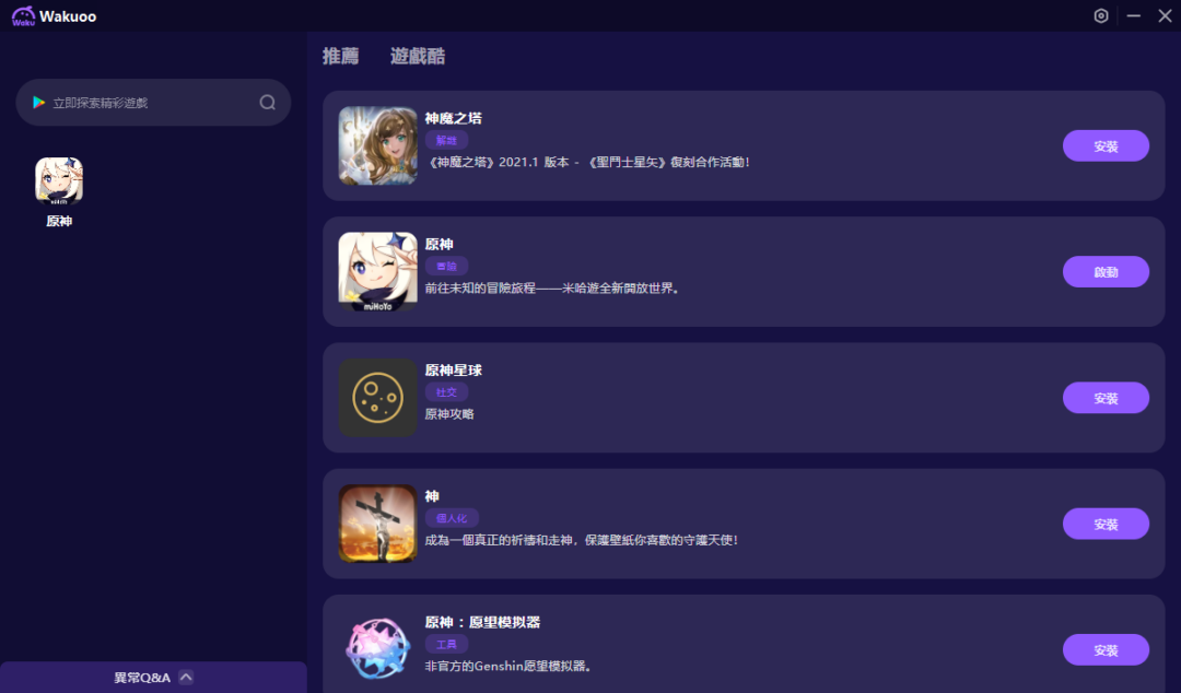 瓦酷設計了一個作為控制台的介面,讓使用者可以直接點擊遊戲的「安裝」或「啟動」來快速進入遊戲中,並且它會自動調用 Android 7 與 9 系統版本以確保遊戲和模擬器的相容性。