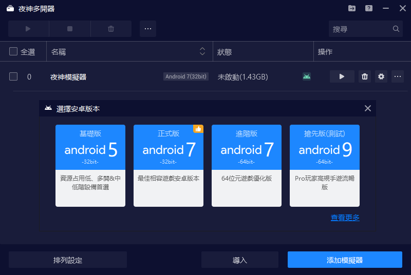 新版的夜神多開器已經將 32/64 位元與 Android 5、7、9 版本都包在一起了,預設是使用 Android 7 32 位元。如果有要執行需高效能的遊戲,新增一個 Android 9 系統的模擬器來跑會比較好。