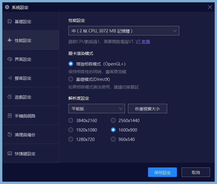 因為模擬器是運作於虛擬機上,所以我們可以視電腦當前的資源用量來決定要給他多少性能。對於渲染方面他有提供 OpenGL 和 DirectX 兩種方式,如果你的電腦是 Intel CPU,在使用 OpenGL 時有可能會發生些外觀 Bug,這時只要將渲染模式更換為 DirectX 即可解決。
