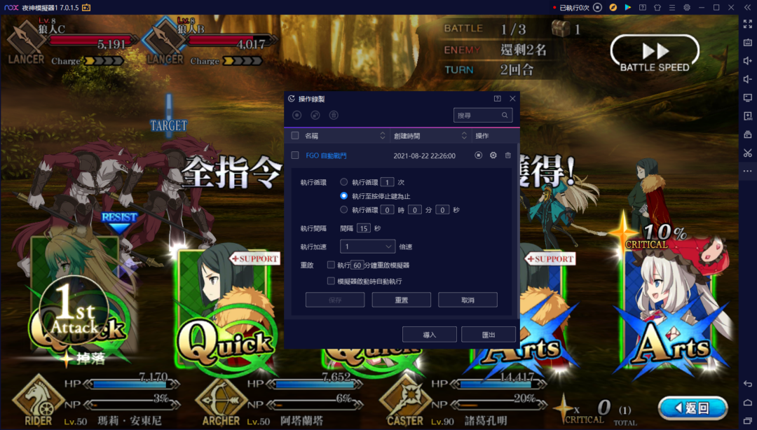 FGO 也算老手遊了,其本身不怎麼吃效能,在夜神與瓦酷模擬器中都可以正常運行。雖然瓦酷因為沒有腳本功能而無法像夜神一樣掛機過關,但這兩款模擬器在用搖桿或按鍵輸入技能指令方面倒是意外的便利。