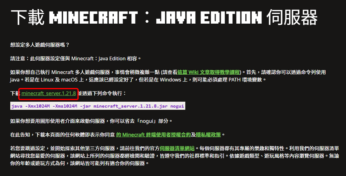 首先,你需要從 Minecraft 官方網站下載伺服器核心檔案。