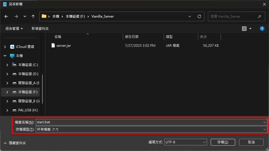 輸入完成後,請按下 Ctrl + S 儲存檔案。在儲存對話框中,請務必將「存檔類型」更改為 「所有檔案 (.)」,然後將檔案命名為 start.bat。請將這個 start.bat 檔案儲存到你放置 server.jar 的那個伺服器資料夾中。