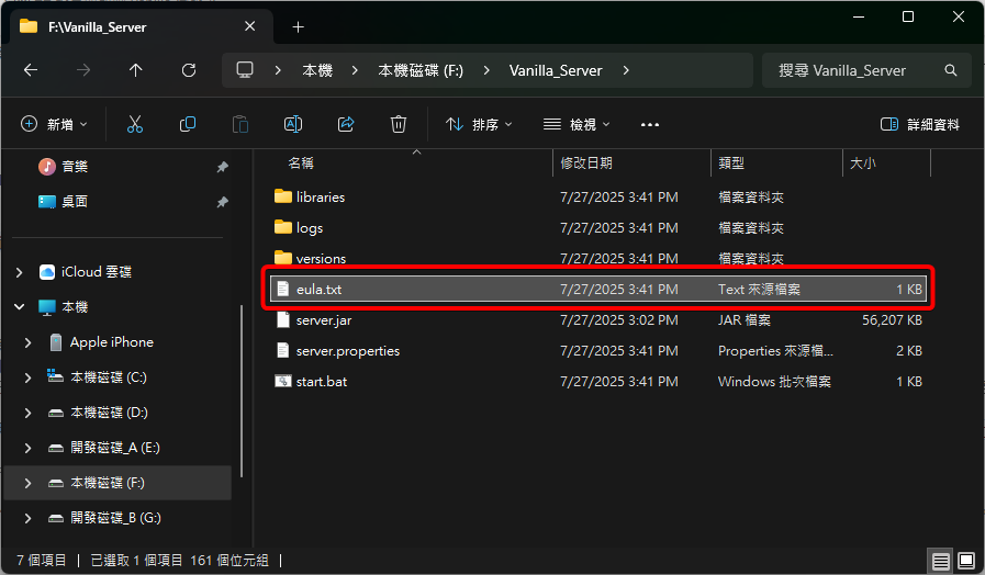下載 server.jar 檔案後,請將它移動到一個 全新的、空的資料夾 中。這個資料夾將會是你 Vanilla 伺服器的根目錄,所有相關的設定檔和世界資料都會儲存在這裡。