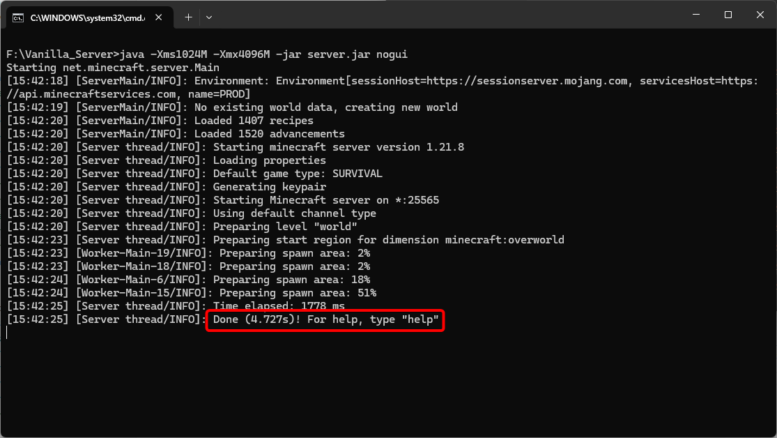 儲存修改後的 eula.txt 檔案後,請再次雙擊你伺服器資料夾中的 start.bat 檔案。這一次,Minecraft 伺服器應該會開始正常啟動。請耐心等待,直到命令提示字元視窗中出現類似 Done (4.727s)! For help, type "help" 的字樣,這就表示你的 Vanilla Minecraft 伺服器已經成功啟動並開始運行了!