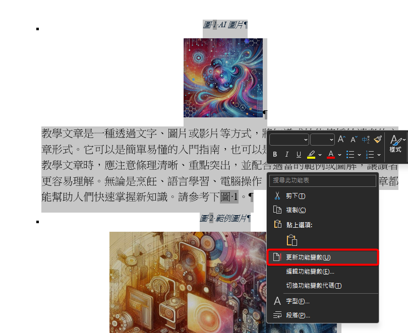 - 在文件內容的任何位置點擊滑鼠右鍵,在彈出的選單中選擇「更新功能變數 (Update Field)」。