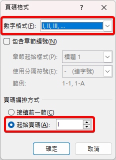 - 在「頁碼格式」視窗中,將「數字格式 (Number format)」下拉選單設定為「Ⅰ,Ⅱ,Ⅲ,…」。然後在「頁碼編排方式 (Page numbering)」下,選擇「起始頁碼 (Start at:)」並將其設定為「Ⅰ」。點擊「確定」。