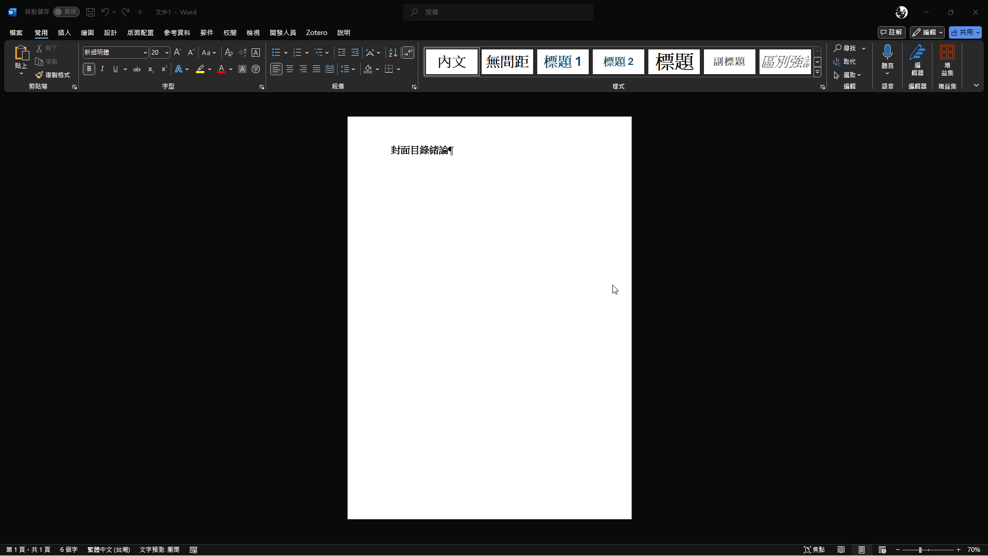 - 在文件開頭,依序輸入你的主要區塊標題,例如:封面、目錄、緒論。這些將代表你論文中的三個主要頁碼區塊。