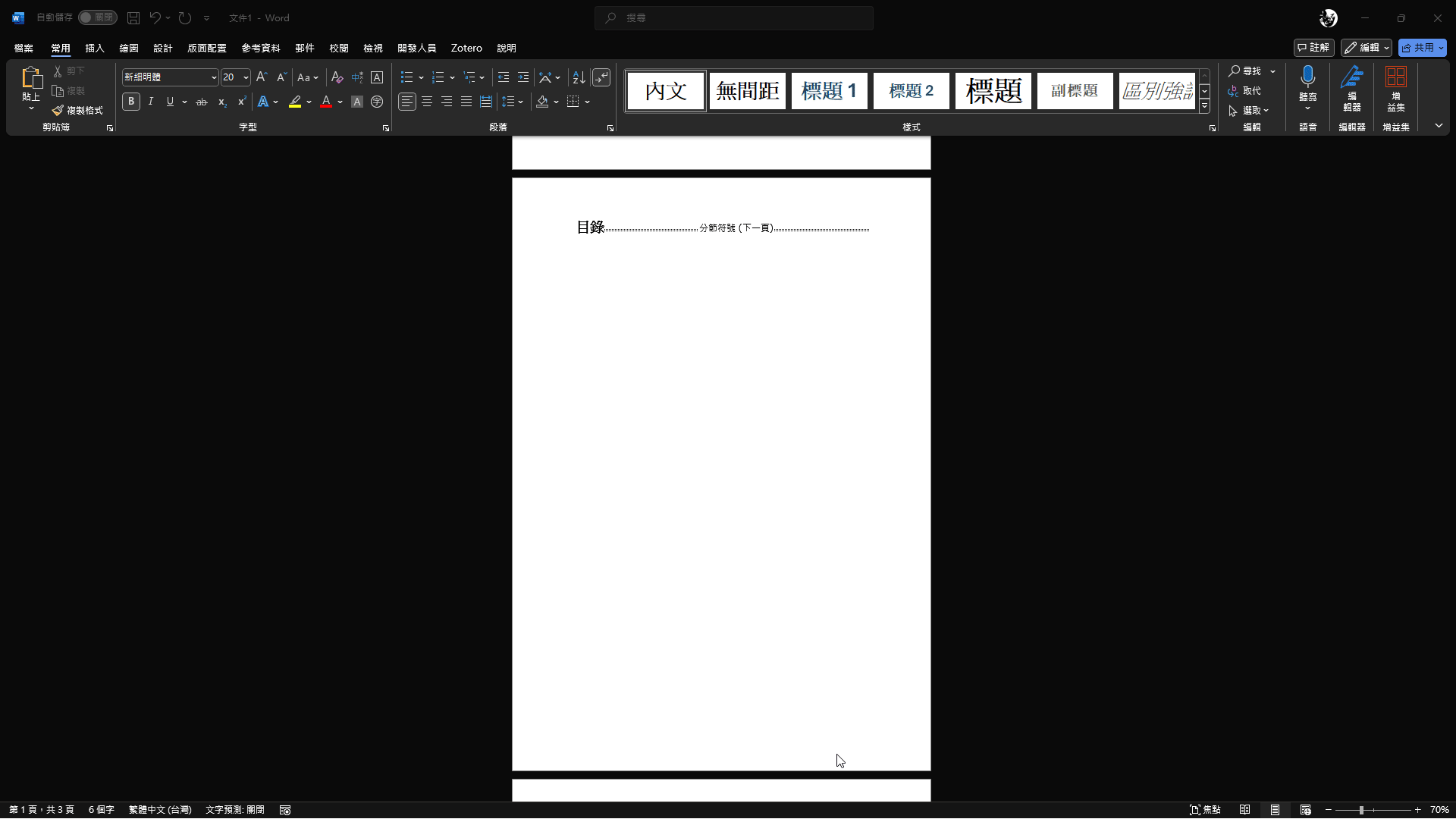 - 重複此步驟,在所有需要獨立頁碼的區塊之間插入「下一頁」分節符號。完成後,你會發現這三個標題將被切割成三頁,分別位於三個不同的「節」。