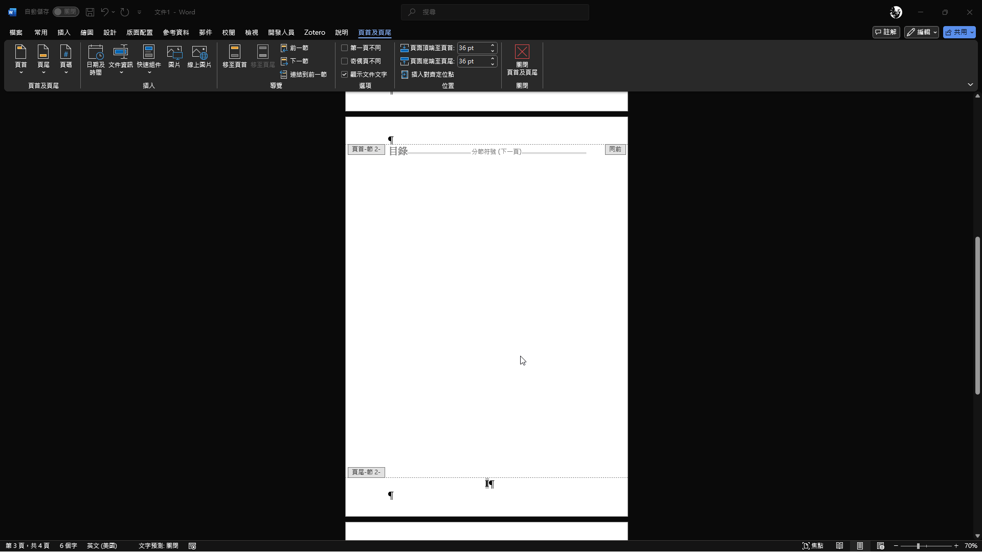 - 點擊緒論頁面(即你設定的第 3 頁)的頁尾空白處,同樣會開啟「頁首及頁尾工具」。